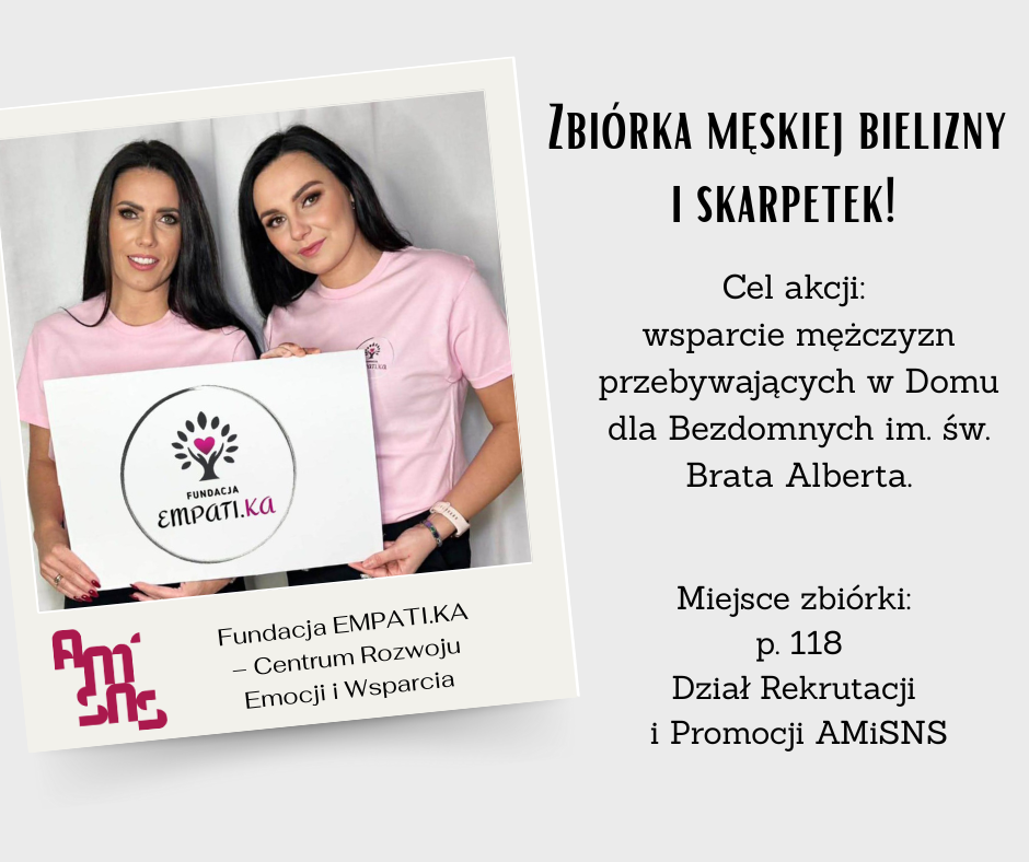 Jako uczelnia włączamy się do akcji organizowanej przez Fundację Empati.ka na rzecz Domu dla Bezdomnych im. św. Brata Alberta w Elblągu. W placówce przebywa obecnie ponad 100 mężczyzn, a potrzeby, które zgłaszane są jako najpilniejsze, dotyczą podstawowych środków codziennego funkcjonowania.