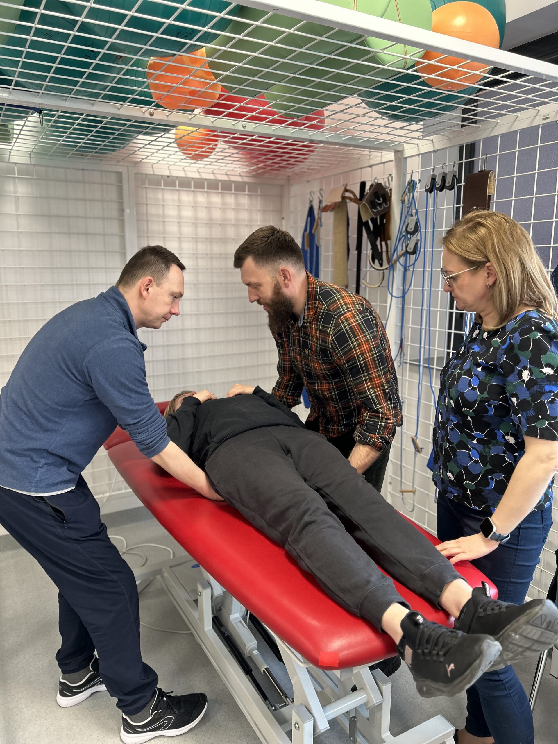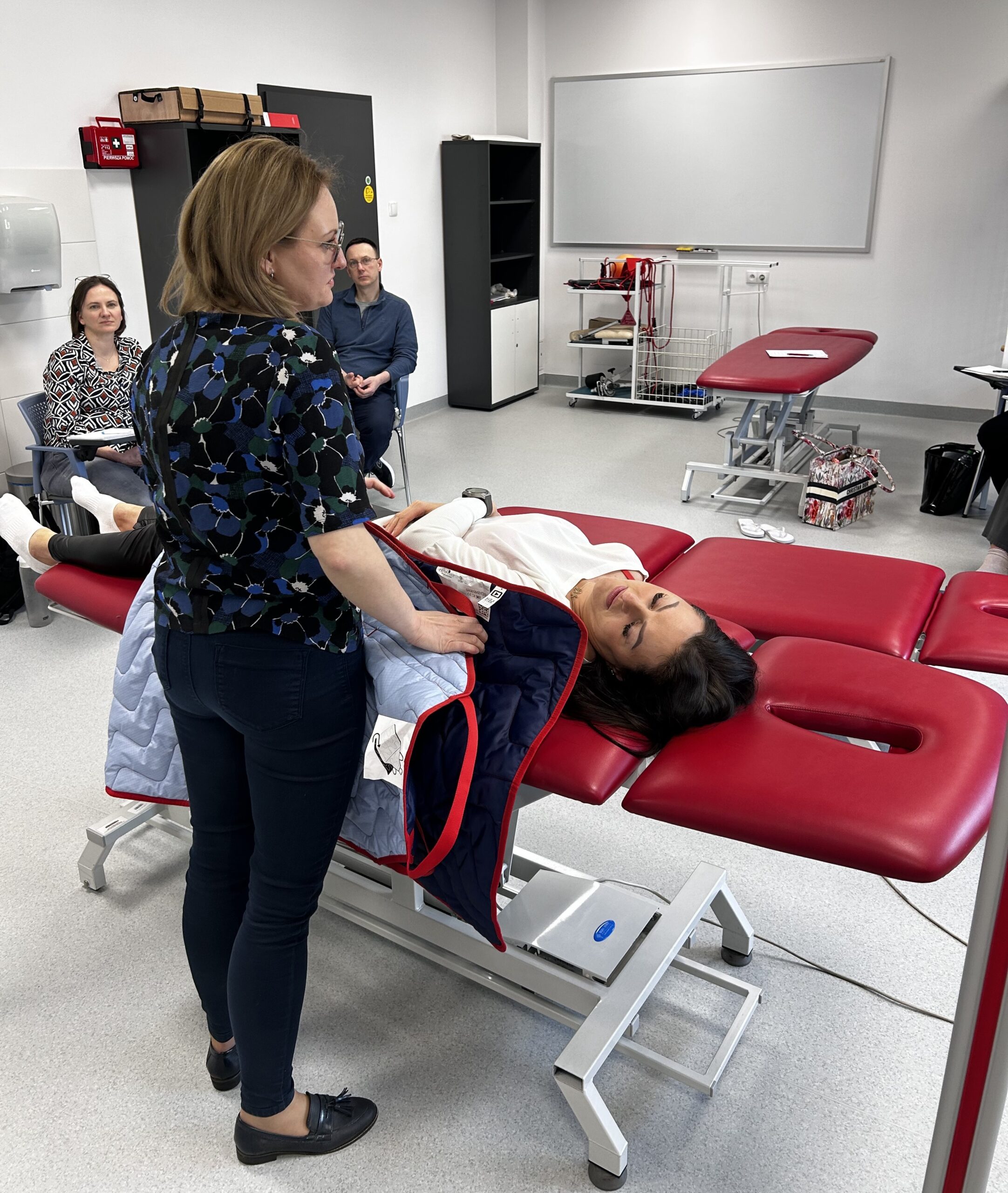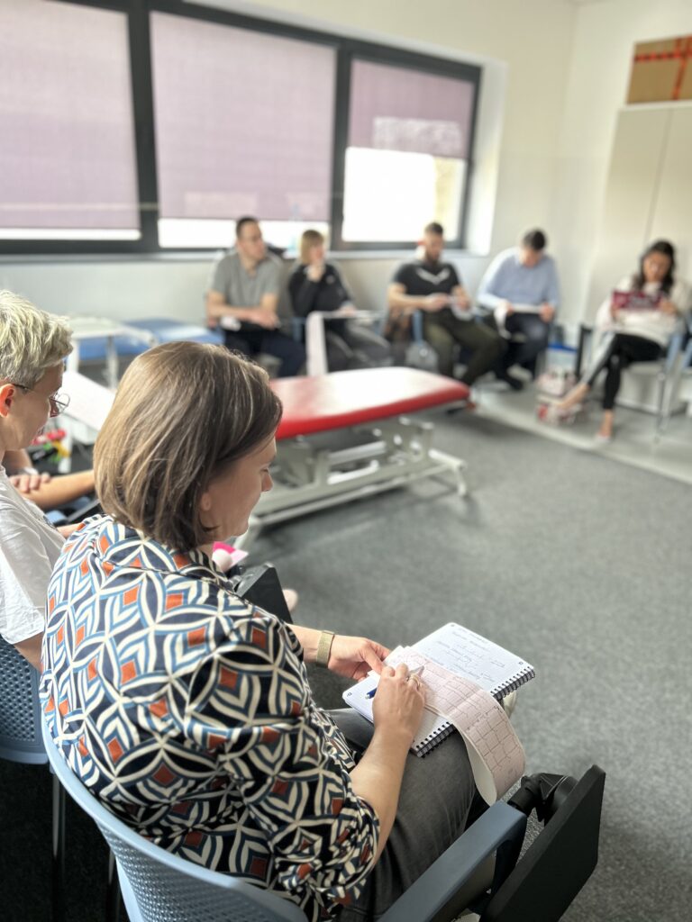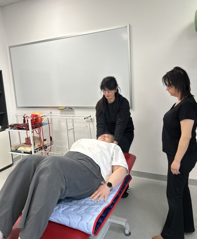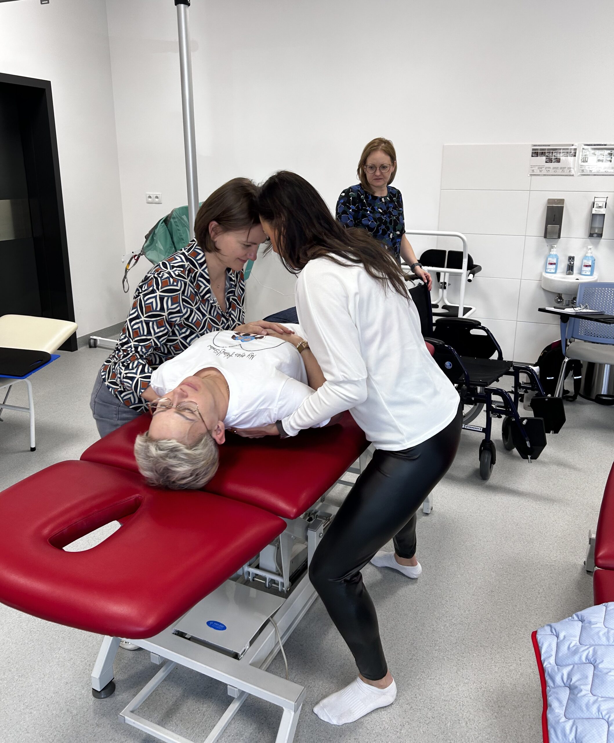 Zajęcia praktyczne odbywały się w specjalistycznych salach dydaktycznych i obejmowały m.in. mobilizację pacjenta, pracę w obrębie łóżka oraz bezpieczne techniki transferowe. Dr Katarzyna Jerka z Uniwersytetu Medycznego w Łodzi prowadziła ćwiczenia, kładąc szczególny nacisk na ergonomię pracy terapeuty oraz komfort pacjenta. Uczestnicy pracowali z wykorzystaniem sprzętu wspomagającego transfery, takiego jak systemy LeaviCare, maty ślizgowe oraz dyski obrotowe, doskonaląc praktyczne umiejętności w warunkach zbliżonych do klinicznych. Omówiono także możliwości uzyskania dofinansowania na sprzęt rehabilitacyjny oraz sposoby komunikacji z pacjentem krytycznie chorym, w tym z użyciem alternatywnych systemów elektronicznych.