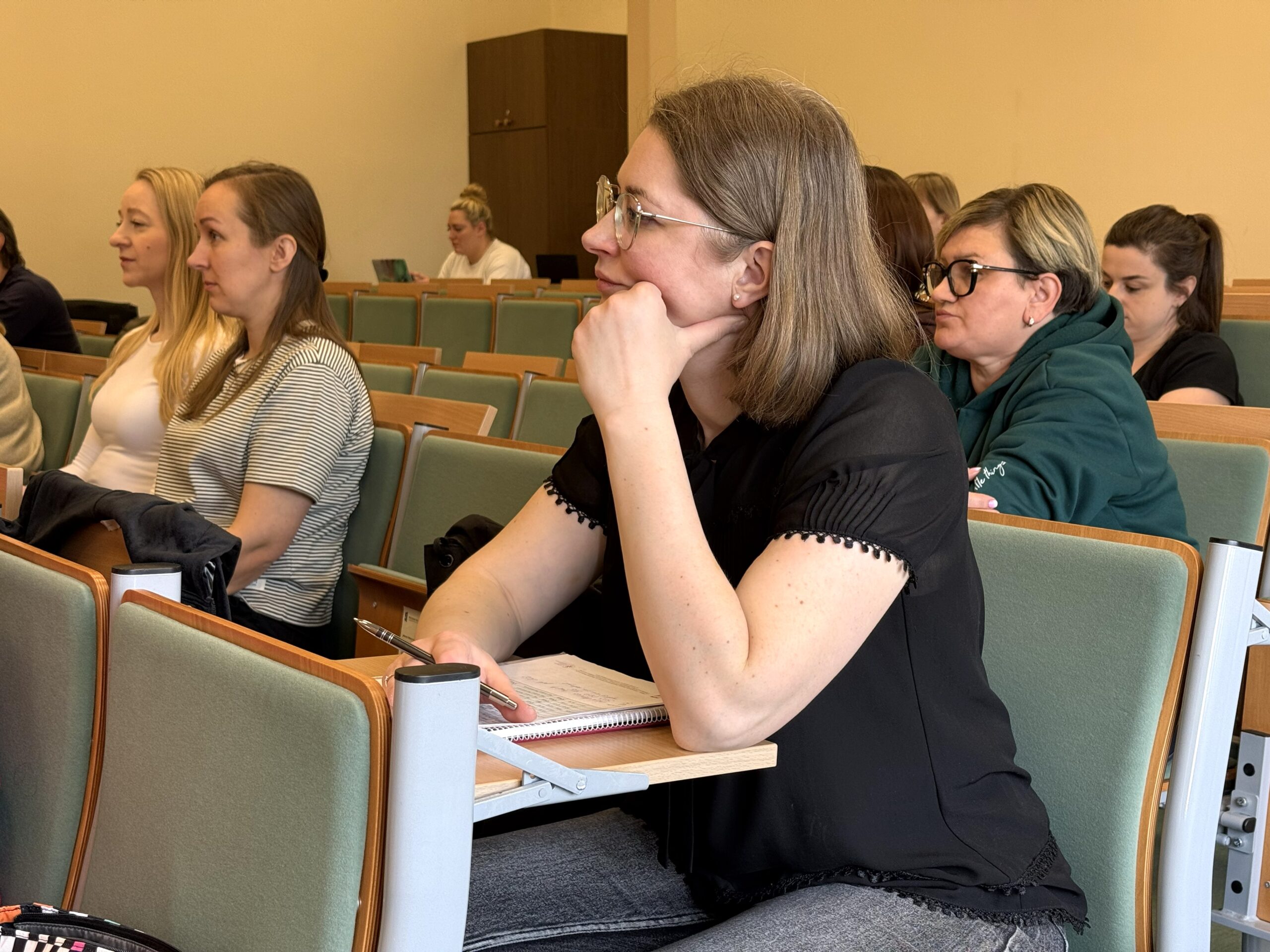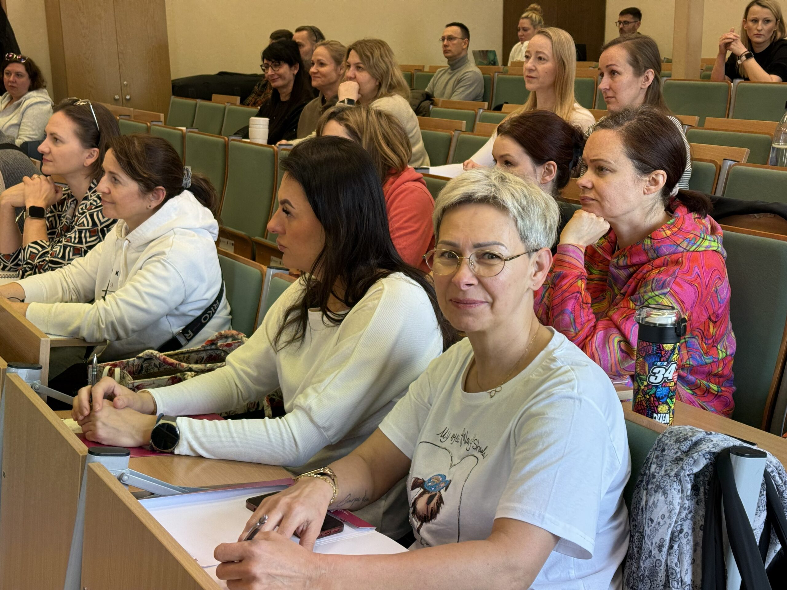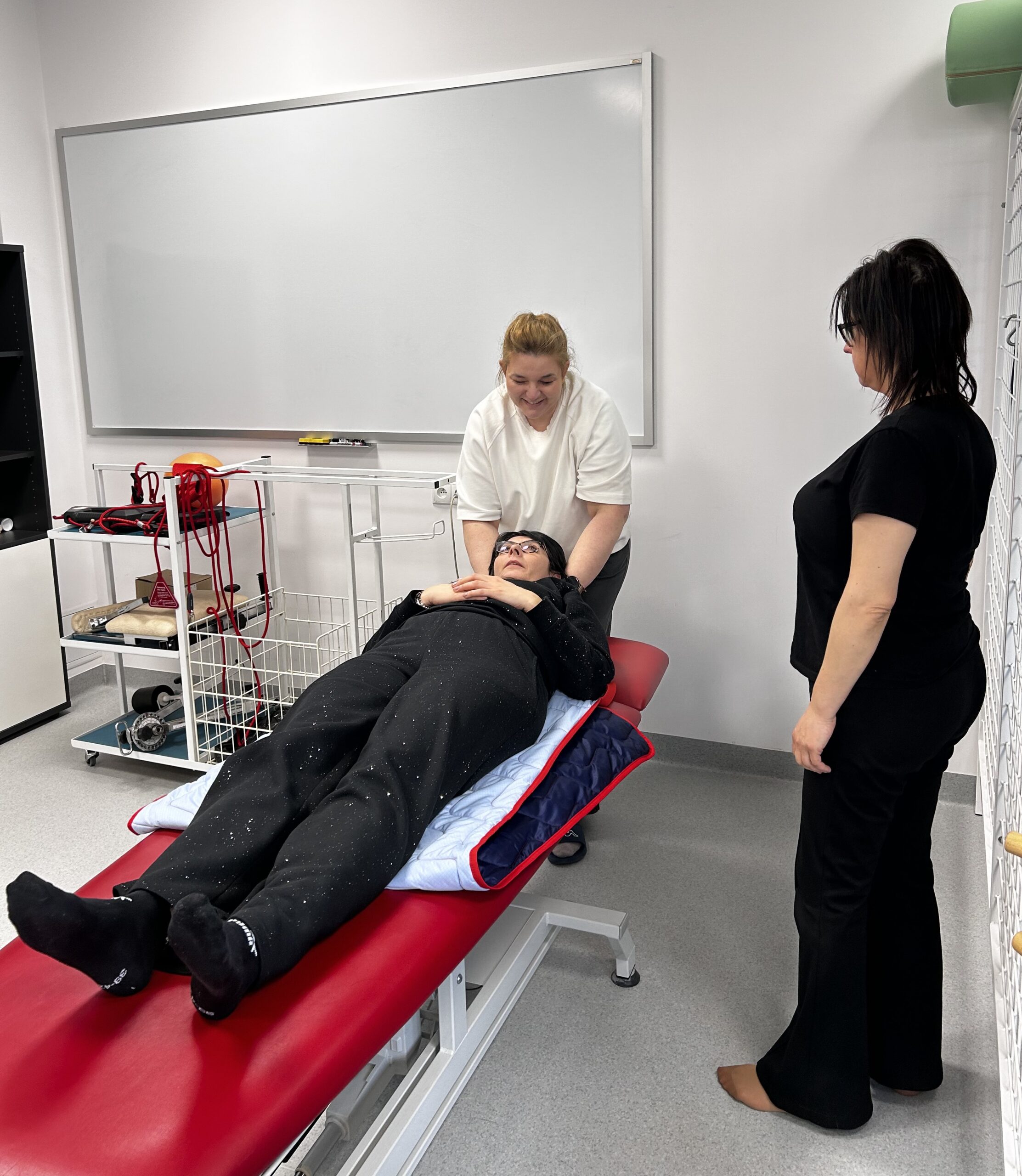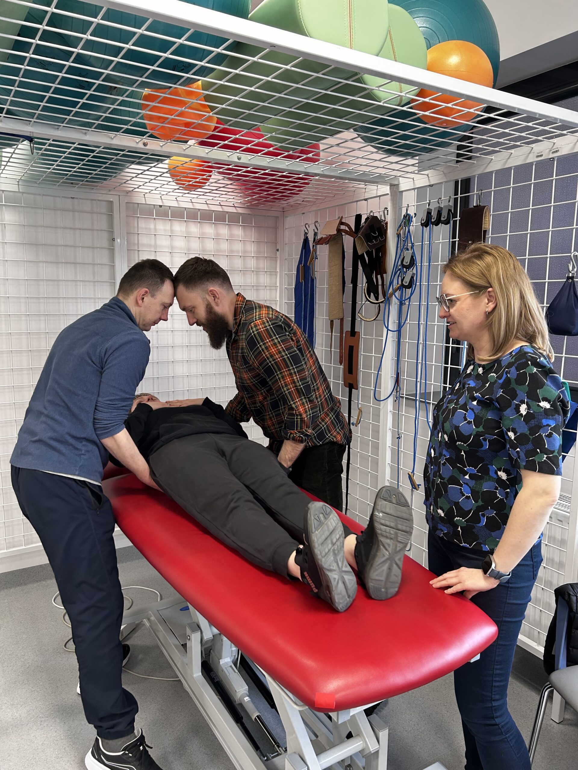 Zajęcia praktyczne odbywały się w specjalistycznych salach dydaktycznych i obejmowały m.in. mobilizację pacjenta, pracę w obrębie łóżka oraz bezpieczne techniki transferowe. Dr Katarzyna Jerka z Uniwersytetu Medycznego w Łodzi prowadziła ćwiczenia, kładąc szczególny nacisk na ergonomię pracy terapeuty oraz komfort pacjenta. Uczestnicy pracowali z wykorzystaniem sprzętu wspomagającego transfery, takiego jak systemy LeaviCare, maty ślizgowe oraz dyski obrotowe, doskonaląc praktyczne umiejętności w warunkach zbliżonych do klinicznych. Omówiono także możliwości uzyskania dofinansowania na sprzęt rehabilitacyjny oraz sposoby komunikacji z pacjentem krytycznie chorym, w tym z użyciem alternatywnych systemów elektronicznych.