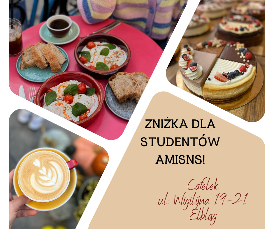 Z przyjemnością informujemy, że studenci Akademii Medycznych i Społecznych Nauk Stosowanych mogą skorzystać ze specjalnej zniżki w elbląskiej kawiarni Cafelek.